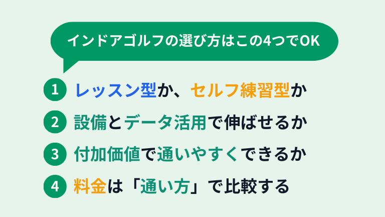 インドアゴルフは店舗ごとに強みが違うため、料金や雰囲気だけで決めると「思っていたのと違う…」となり、時間もお金も無駄になってしまいます。